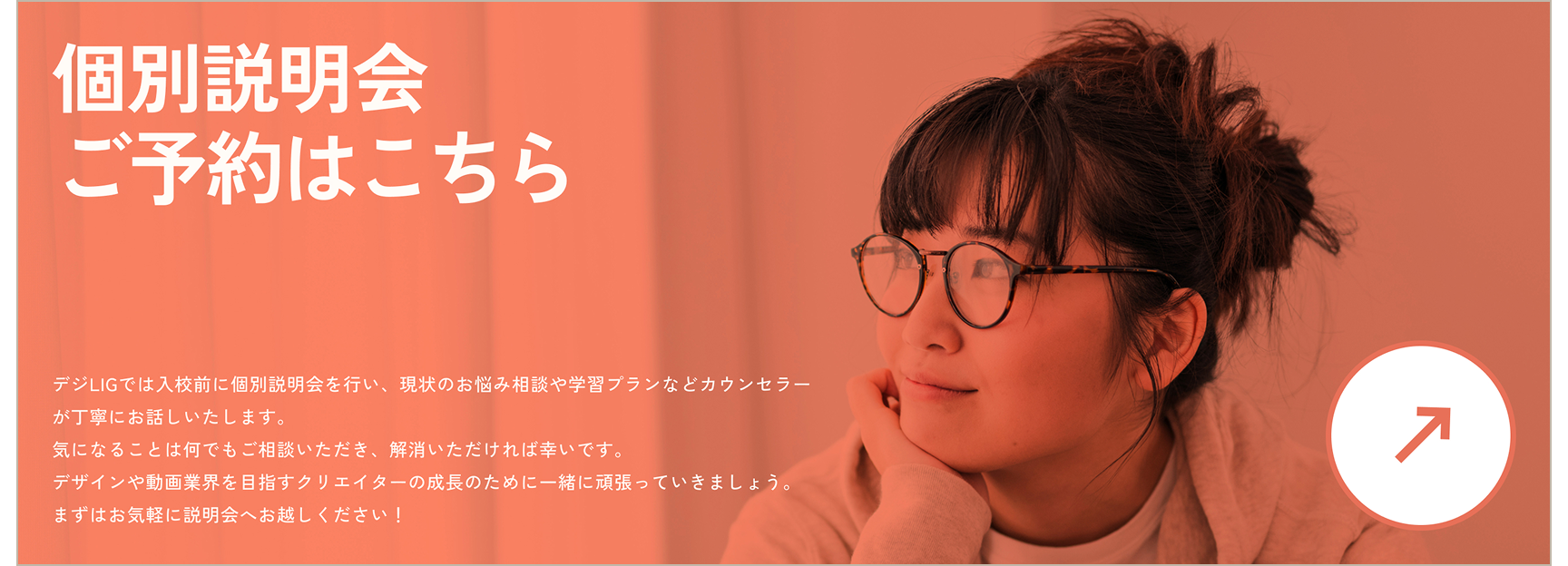 メインカラーであるオレンジを多用しすぎると、大切なポイントが埋もれ、CVへの導線が分かりづらくなる課題がありました。そのため、CVとなる「個別説明会のご予約」以外での使用を抑え、自然とCVへ誘導できるようコントラストを調整しました。