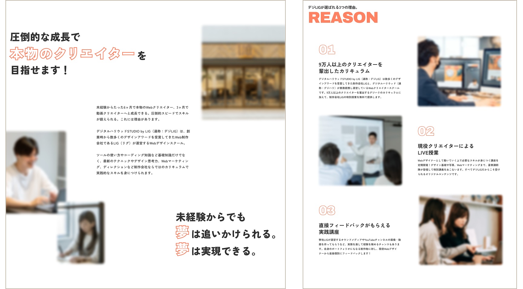 クリエイタースクールを運営する『デジタルハリウッドSTUDIO by LIG(通称:デジLIG)』様の新規受講生向けLPサイトのリニューアルをスクール課題として行いました。数多く存在するスクールの中で、『デジタルハリウッドSTUDIO by LIG』ならではの強みや魅力をデザインで伝え、本気でデザイナーや動画クリエイターを目指す方々の夢を後押しできるLPサイトを目指しました。