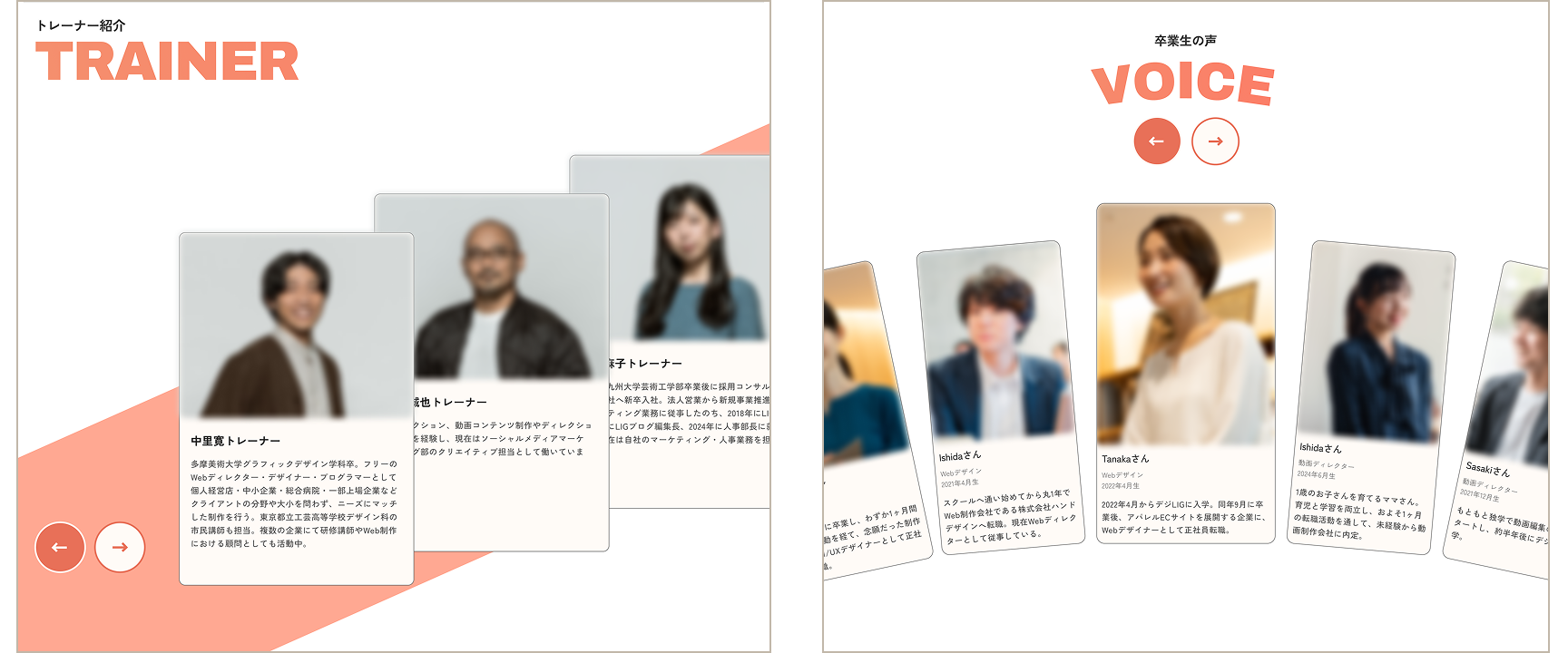 卒業生の声や現役デザイナーとして活躍するトレーナーの紹介セクションをページ下部に設け、受講検討中の方々の信頼を獲得。受講への後押しができるようにしています。